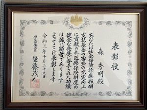 このたび令和3年度の社会保険診療報酬支払基金関係の功績者として厚生労働大臣表彰の受賞と記念品として銀杯をいただきましたのでご報告いたします。例年ですと厚生労働省講堂にて表彰式が行われるところでありますが、新型コロナウイルス感染予防の観点から、表彰式は行われないことになりました。